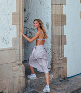 The classic Triangle top with a twist. An essential, fully lined and seamless fixed triangle top with an underbust band. Topped with adjustable spaghetti shoulder straps, ending in a triangle shape in the back and a ajustable hook-and-eye closure.